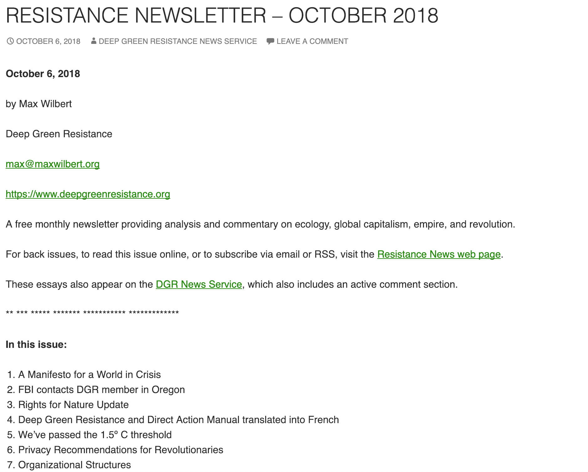 DGR now produces a monthly newsletter which includes resistance news from around the world, as well as updates from various chapters of the organization. To sign up for the newsletter and view the archives, click this link.